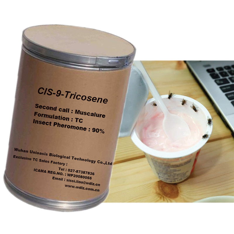 Z-9-Tricosene è un feromone sessuale prodotto dalle mosche domestiche femmine (Musca domestica) per attirare i maschi. Nelle api, è uno dei feromoni di comunicazione rilasciati durante la danza dell'oscillazione. Questo prodotto è un feromone degli insetti sintetizzato dalla nostra azienda utilizzando un metodo di sintesi chimica. Ha un buon effetto attrattivo su scarafaggi e mosche. Può migliorare l'efficacia insetticida degli insetticidi se utilizzato in combinazione con gli insetticidi. Questo prodotto viene utilizzato solo come attrattivo negli insetticidi.